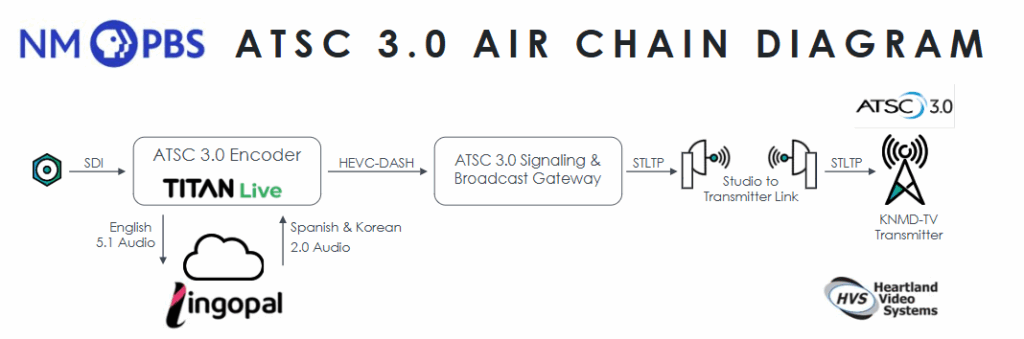 The AI-generated audio tracks, provided as 2.0 downmixes and synchronized with the original video, were reintegrated into the Ateme encoder’s ATSC 3.0 multiplex. Subsequently, the station broadcasted the KNME-HD service with the additional language tracks instead of the original English-only stream. This entire setup maintained end-to-end timing accuracy, a crucial aspect for real-time ATSC 3.0 applications.